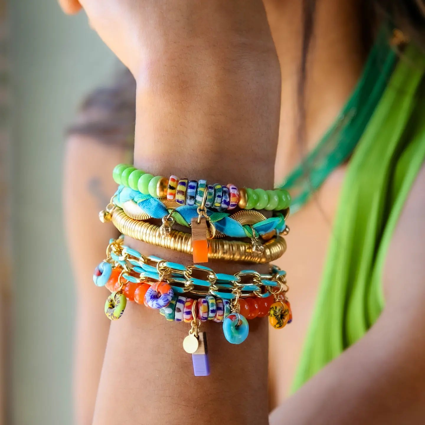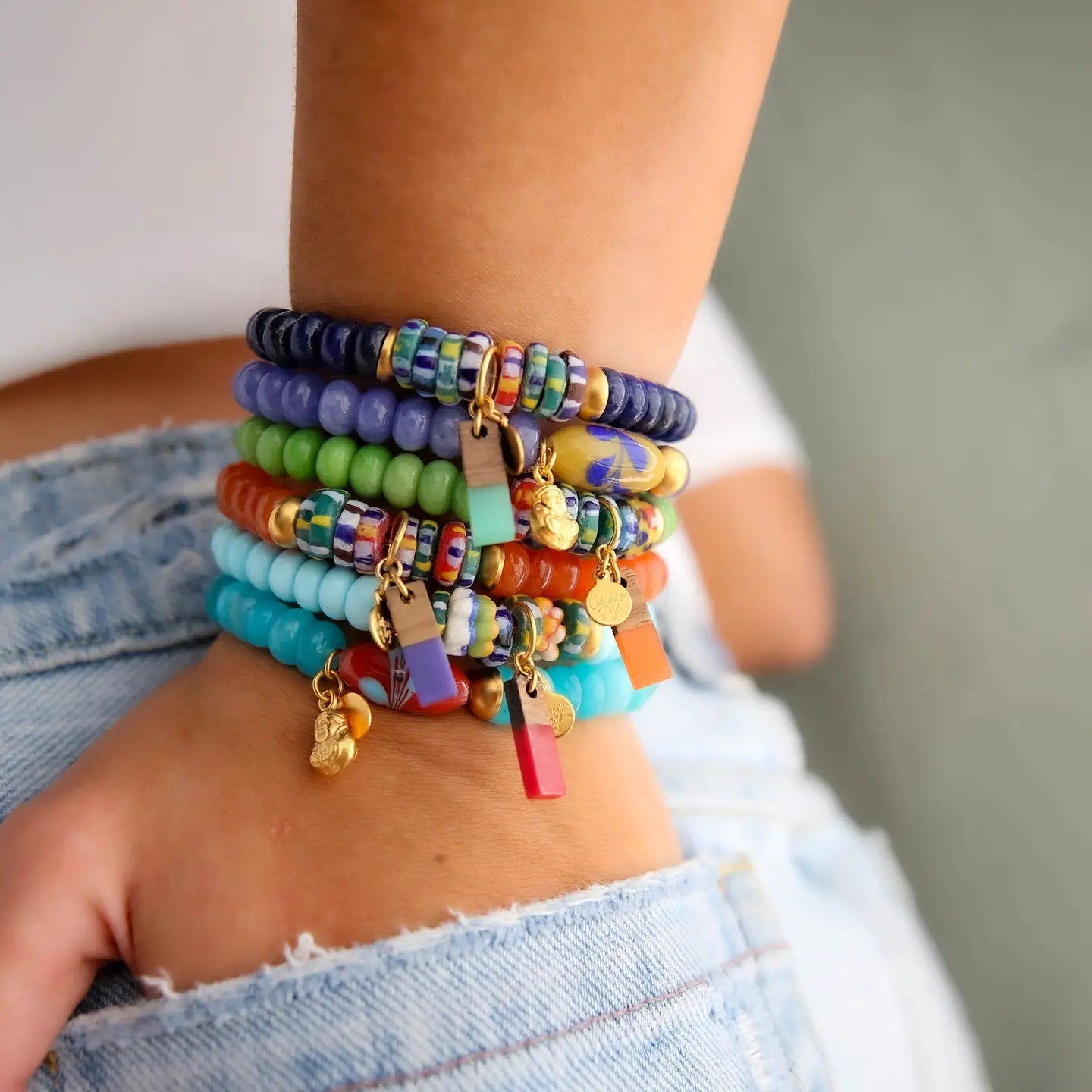 A joyful mix of bold ivory jade beads and multi-colored accents creates a cheerful, eye-catching look. Finished with a resin pendant and gold detailing, it brings a playful spirit and individuality to any stack — or shines just as well on its own. Designed with a comfortable stretch fit for effortless, everyday wear.