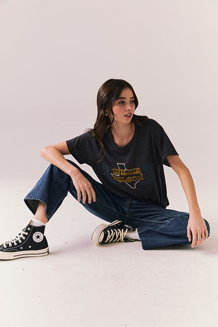 A vintage-inspired graphic tee celebrating Willie Nelson, featuring a Texas state outline and classic cowboy boot motif. Cut from soft cotton with a crew neckline and relaxed fit for an easy, lived-in feel.