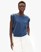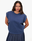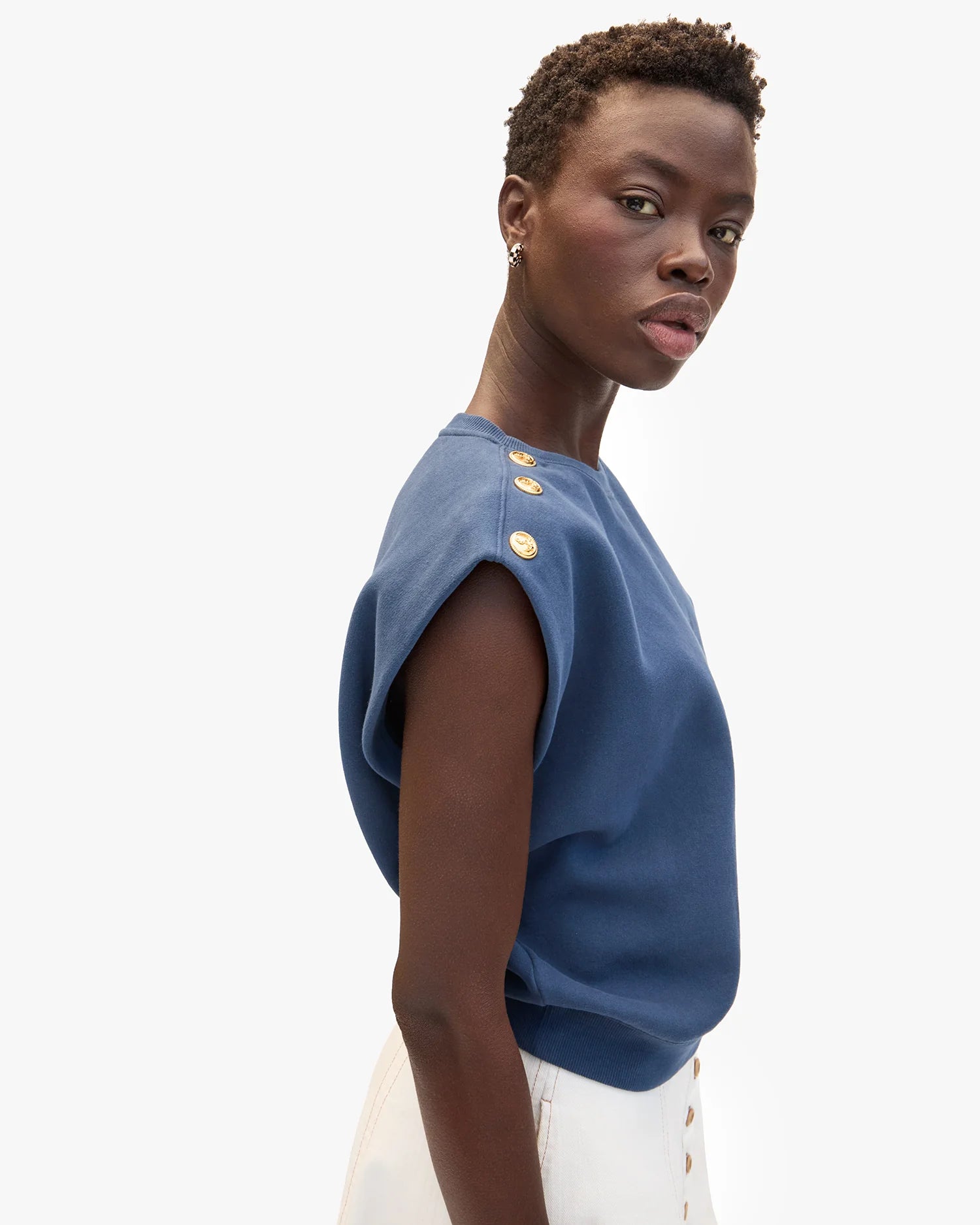 Cap-sleeved and full of charm, this fleece vest is your new layering hero. Made from 100% cotton fleece for unbeatable comfort, it features gold anchor buttons at the shoulder seam for a playful, polished touch. Cozy meets cool in the most effortless way.