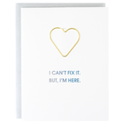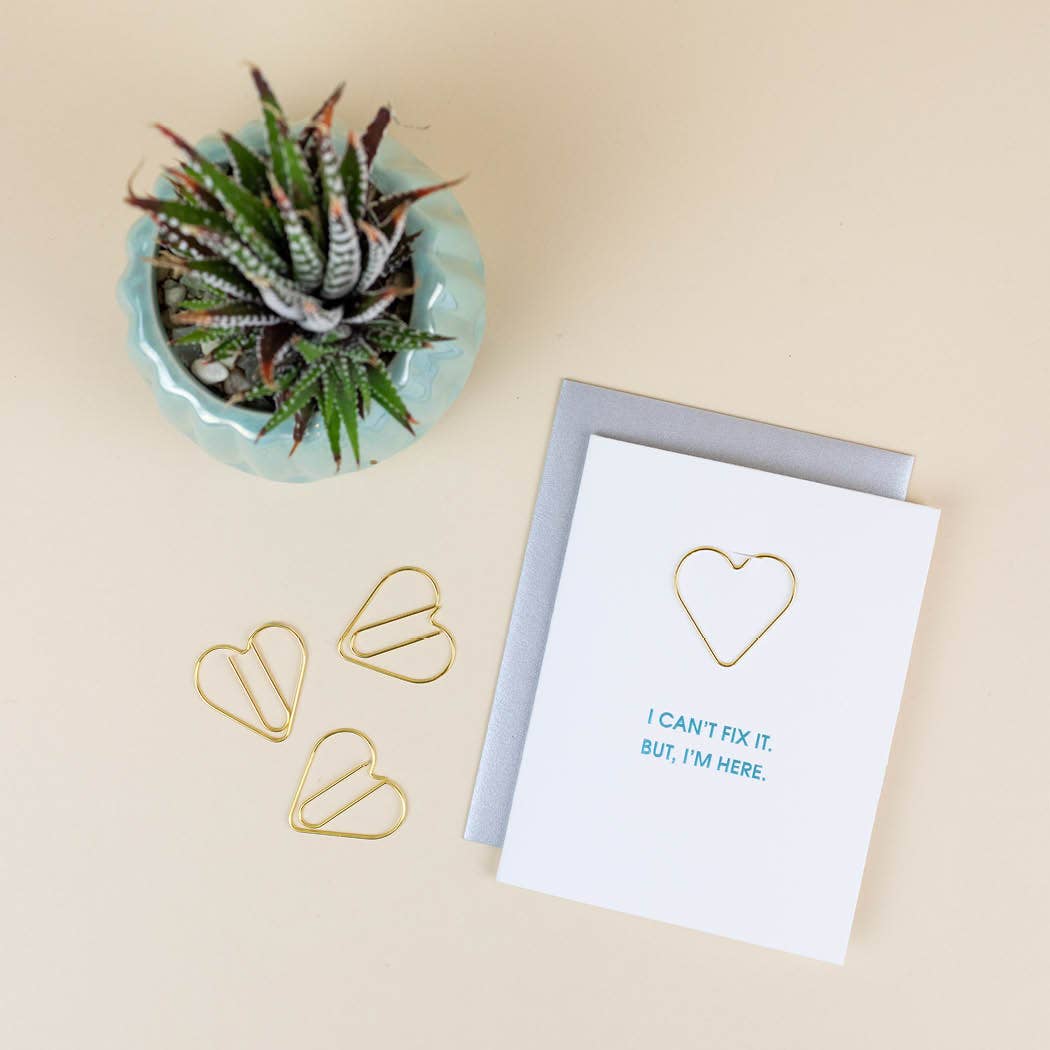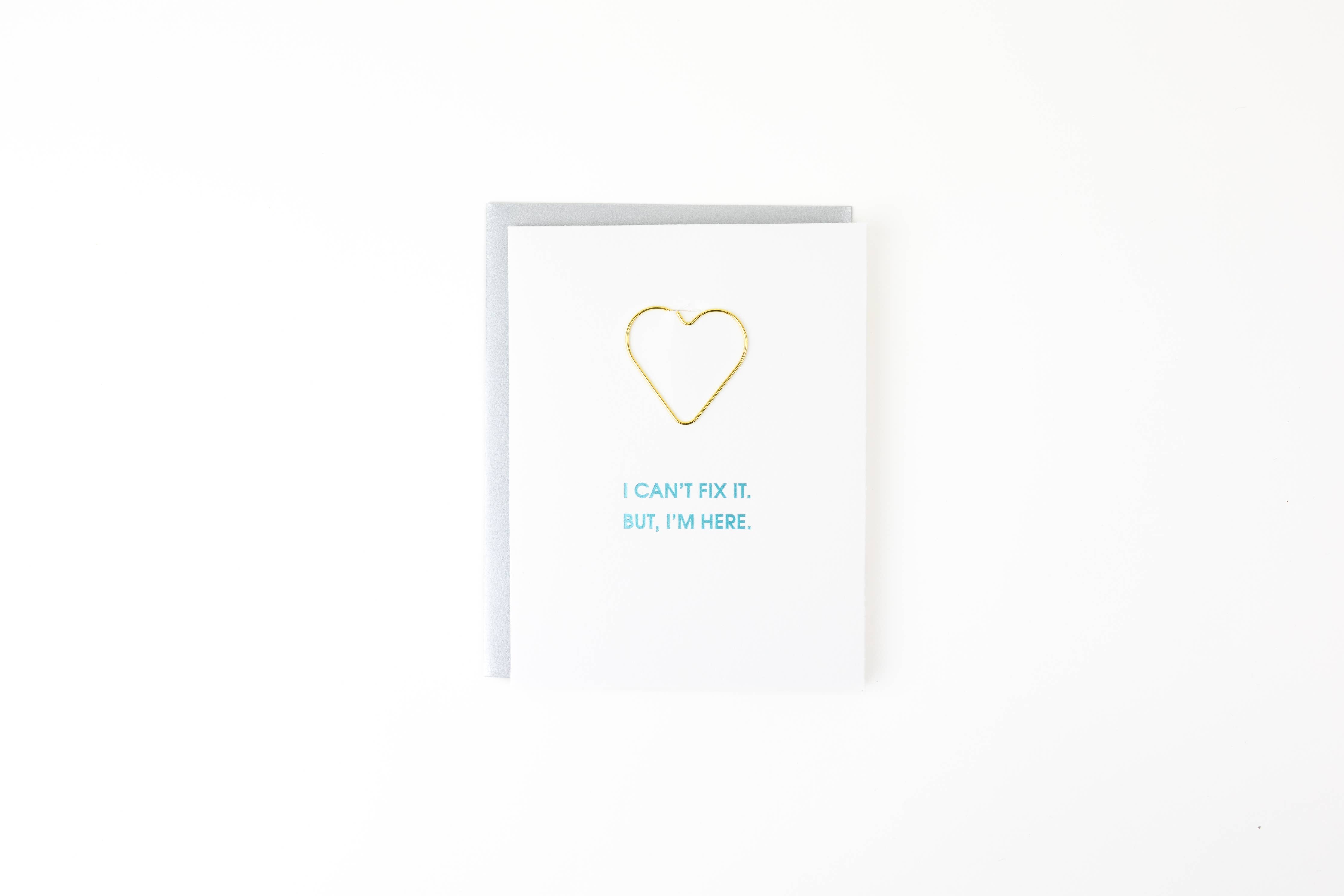 The “I Can’t Fix It, But I’m Here” card is letterpress printed on a vintage printing press in sunny California, giving it a timeless, tactile finish. Each card includes a heavy-duty heart-shaped paper clip for an extra thoughtful touch. The paper clip can be used inside the card to hold a gift card or cash, and afterward, it doubles as a keepsake paper clip or bookmark.