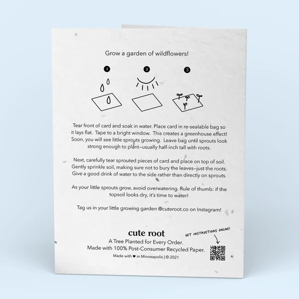 Each card is embedded with a non-invasive wildflower seed mix, including Alyssum, Catchfly, Siberian Wallflower, Black-Eyed Susan, and Baby Blue Eyes.