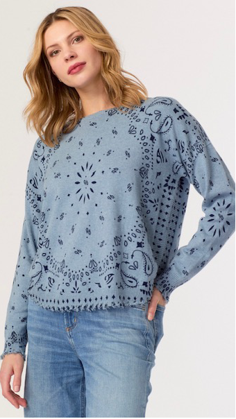 A fresh take on a classic knit, this crewneck sweater is patterned with a bandana-inspired design for a playful yet polished look. The relaxed fit is finished with smocked detailing at the hem and cuffs, adding texture and shape. An easy piece to pair with denim, it brings a pop of personality to your everyday rotation.