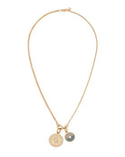 Strength on one side, peace on the other—a balanced pair for whatever the day brings. This necklace features a polished gold-tone delicate chain accented with two meaningful medallion charms. A starburst crystal charm is engraved with “STRENGTH” on the back, while a blue crystal shield charm reads “PEACE.” Finished with a secure lobster clasp, it’s a symbolic piece designed to be worn every day.