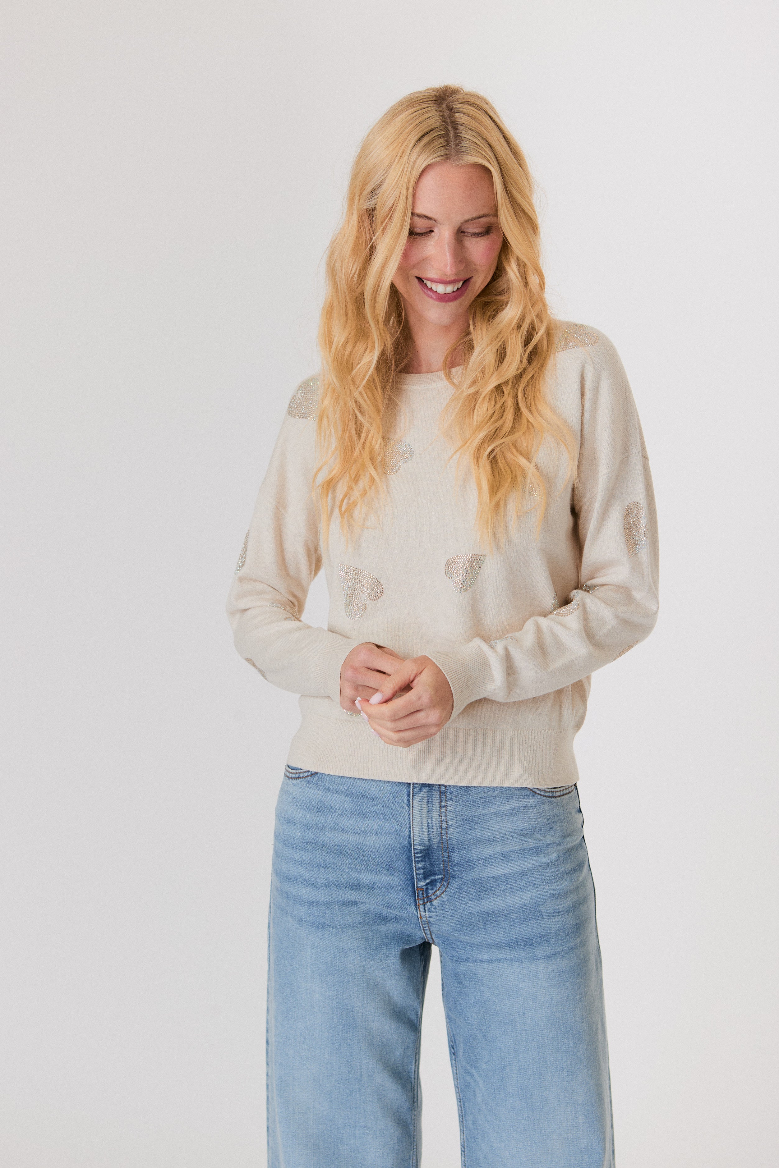 The Glitter Heart Crew brings a playful touch of sparkle to an everyday essential. Designed in a soft, lightweight knit, this classic long-sleeve sweater features scattered heart motifs embellished with subtle shimmer for just the right amount of shine. With its easy fit and timeless crew neckline, it pairs effortlessly with denim or tailored trousers, making it a go-to piece that feels equal parts cozy and chic.