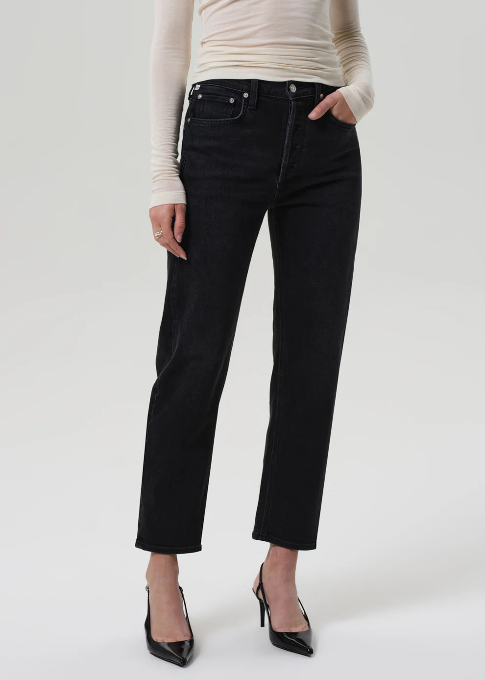 The Delfina Jean is a high-rise straight-leg style cut from comfort-stretch archive denim with a soft, broken-in feel. Designed to flatter while keeping all-day ease in mind, it’s a versatile staple with a polished finish. The Willow wash—a deep black with subtle whiskering—gives it a clean, modern edge, perfect for pairing with everything from crisp shirting to cozy knits.