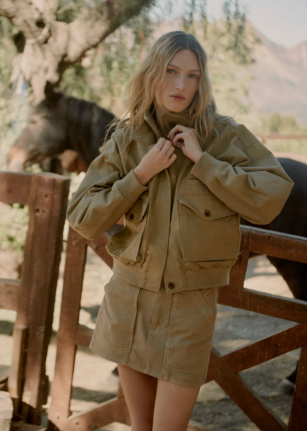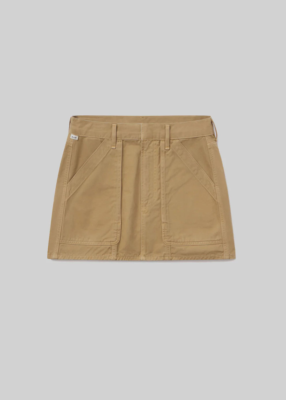 This utility mini skirt is crafted from luxe, heavyweight twill made with regenerative cotton, offering structure and durability with a premium feel. Designed in a medium khaki hue, it features long patch pockets and a clean hem for a modern, workwear-inspired look. Fits true to size.