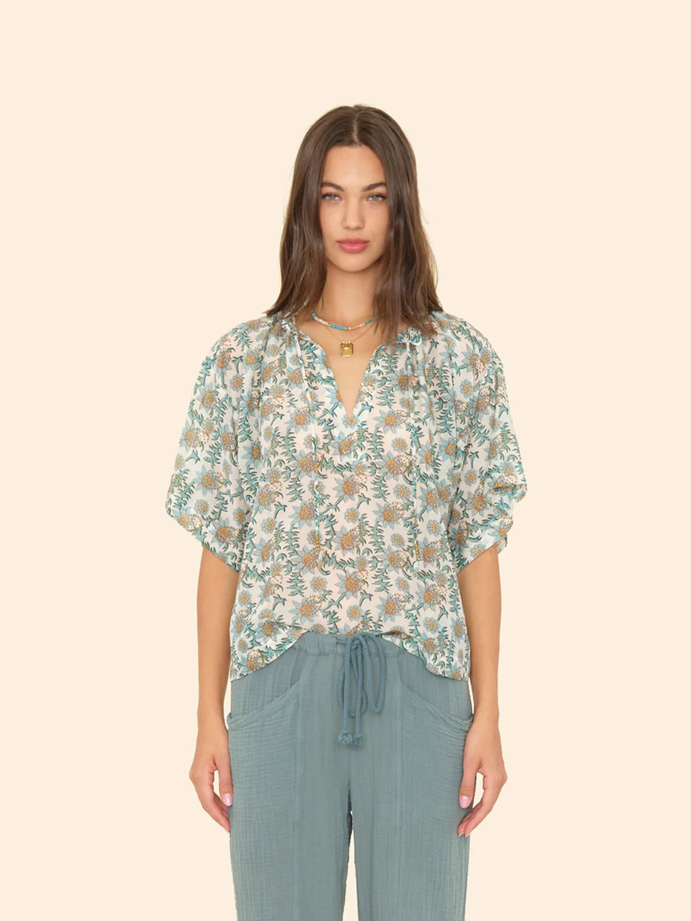 Flower power in full bloom. The Meadow Top is crafted from our new floral cotton gauze for an airy, lightweight feel. This relaxed popover style features a flattering V-neck with a beaded self-tie accented by antique brass beads, ruffle trim, elbow-length sleeves, and a softly ruched back—effortless and feminine from every angle.