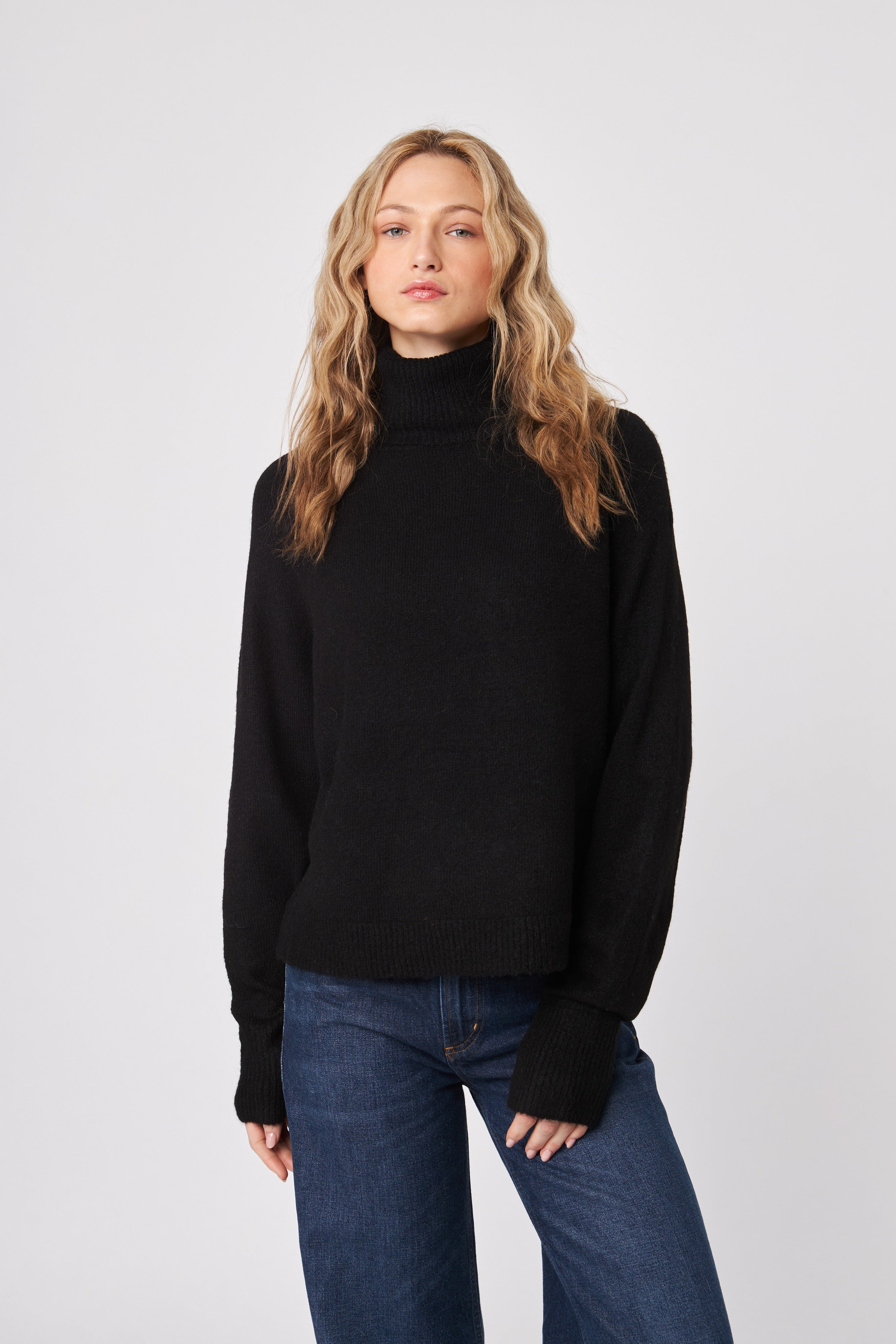 Classic turtleneck sweater in deep navy, designed with a relaxed fit for effortless layering. Finished with ribbed trim at the neckline, cuffs, and hem, it offers a timeless silhouette with a cozy, polished feel.