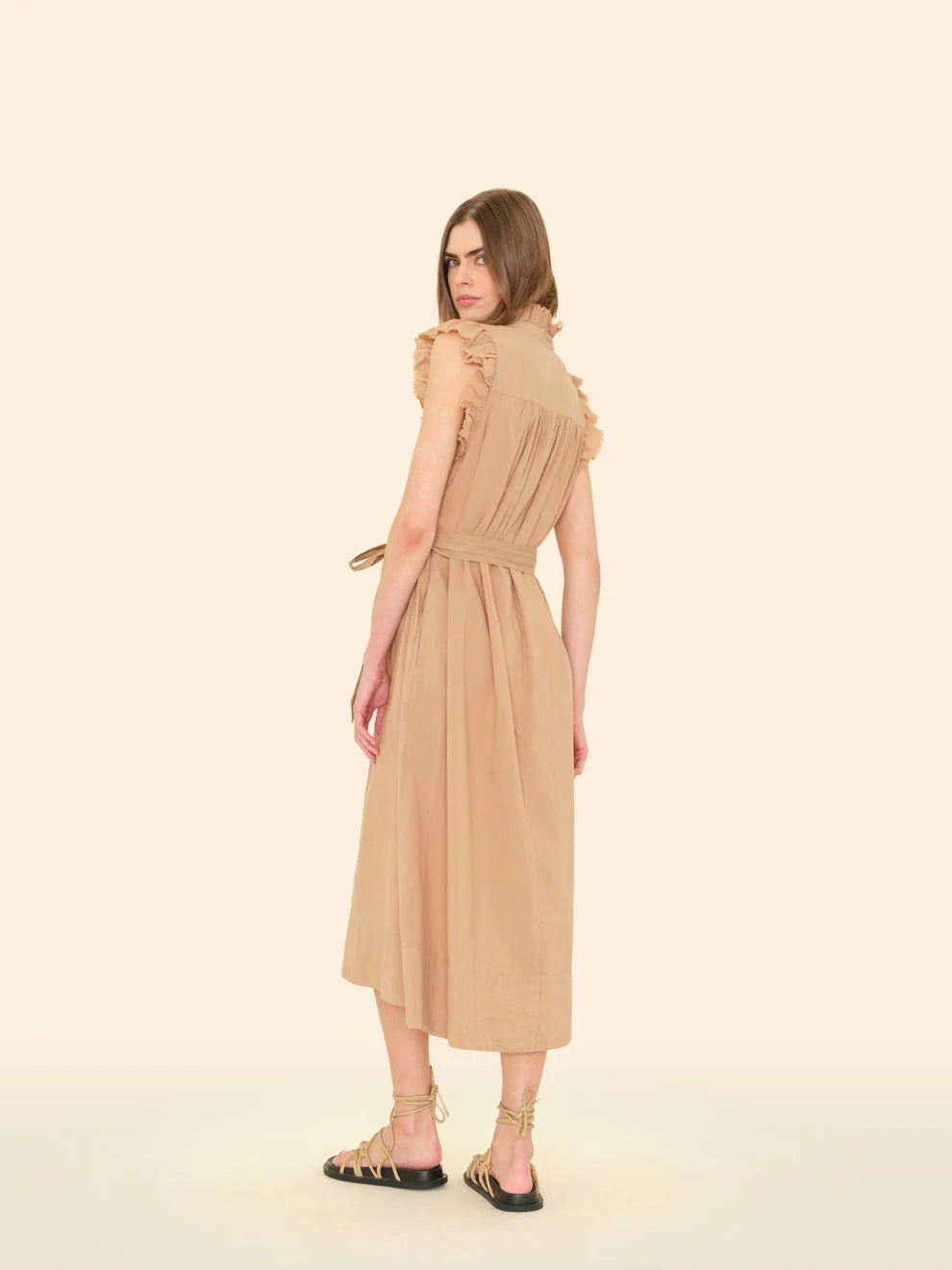 Blooming Marvelous. Meet April, a new season standout in vintage-inspired cotton silk voile with a delicate floral print. This fully lined midi dress is brimming with charm, featuring ruffle accents along the neckline, front placket, and sleeves. Designed with a partial button-front, side seam pockets, and a self-tie wrap waist, it’s the perfect blend of effortless elegance and playful romance.