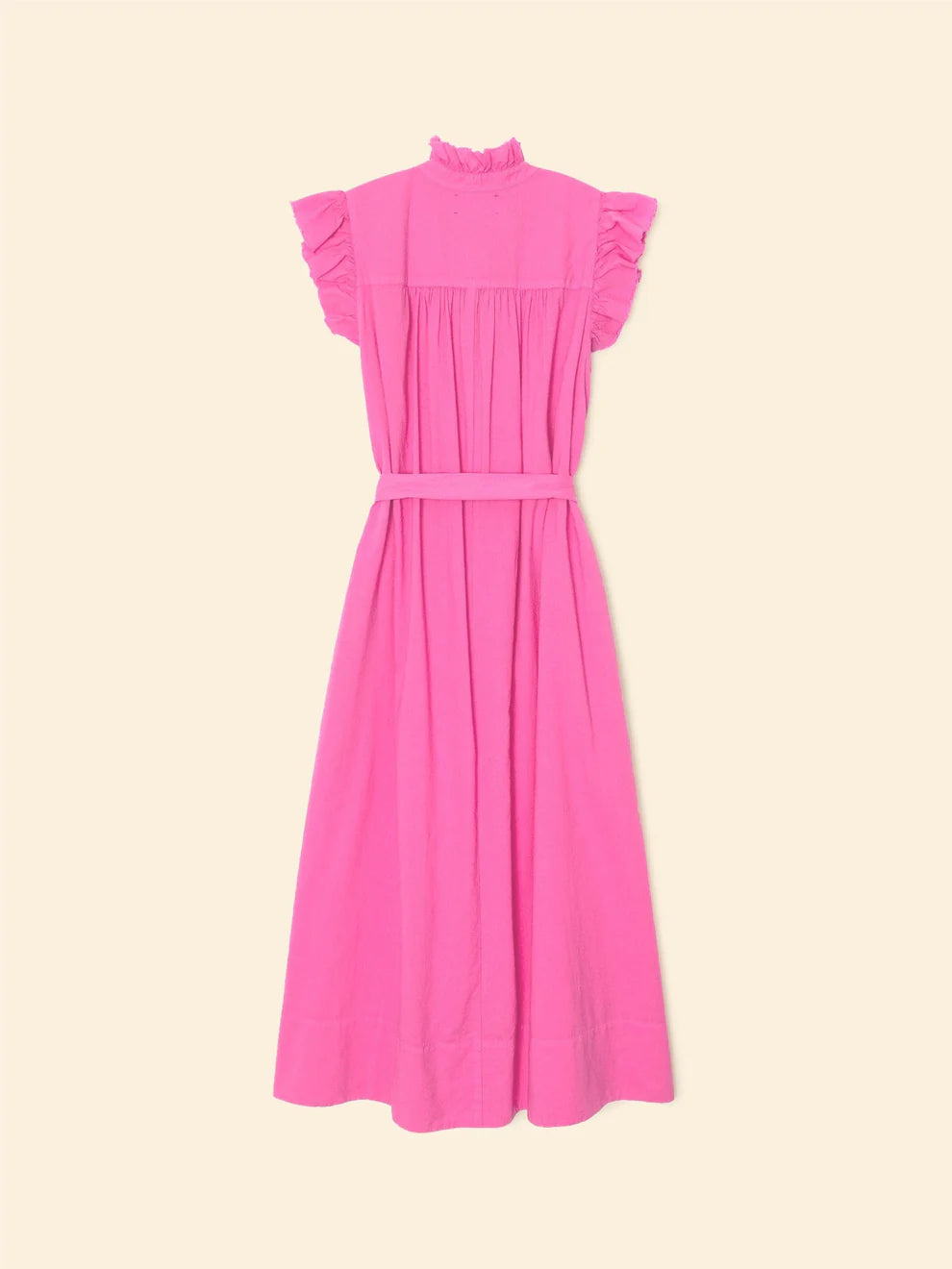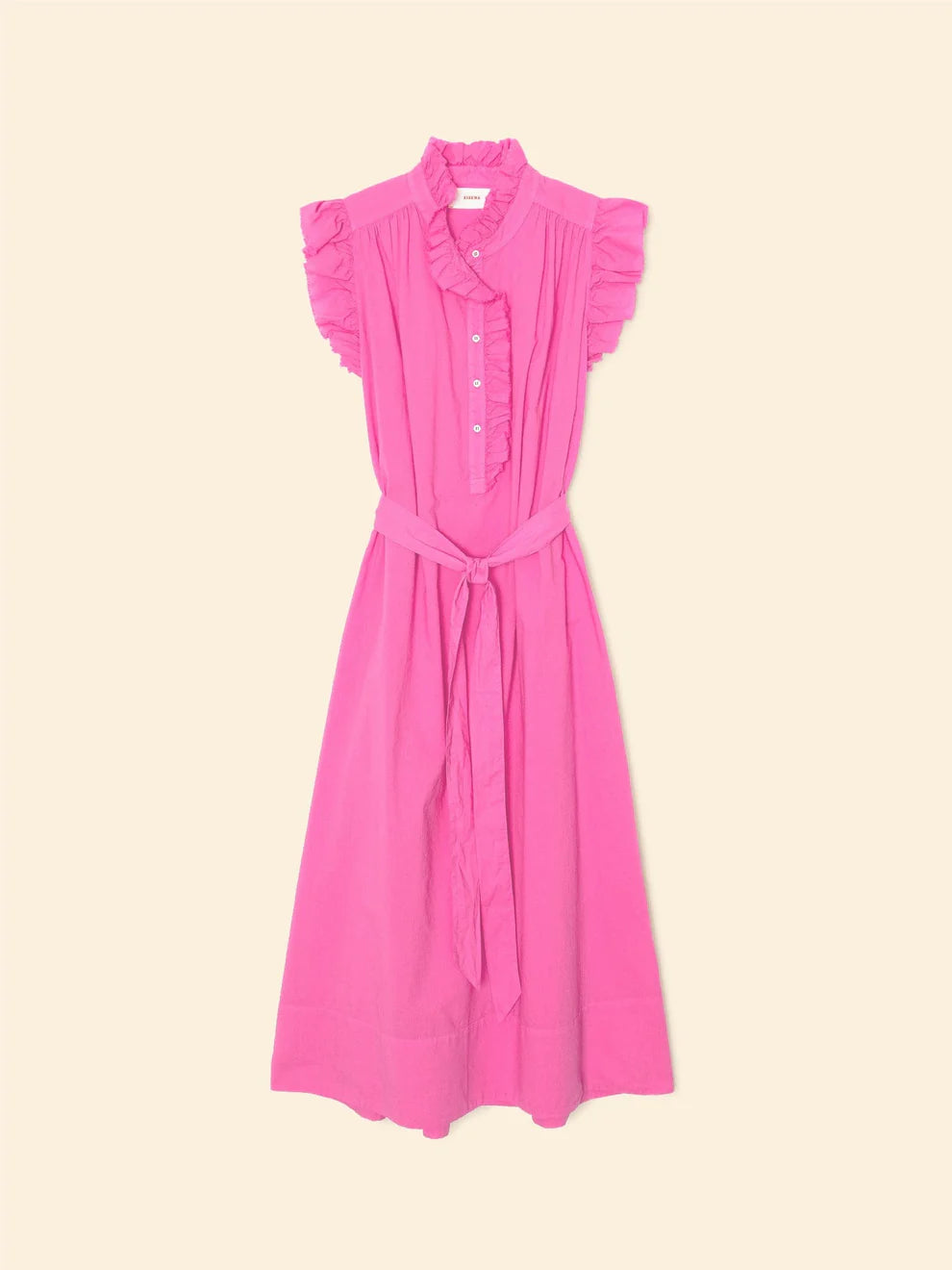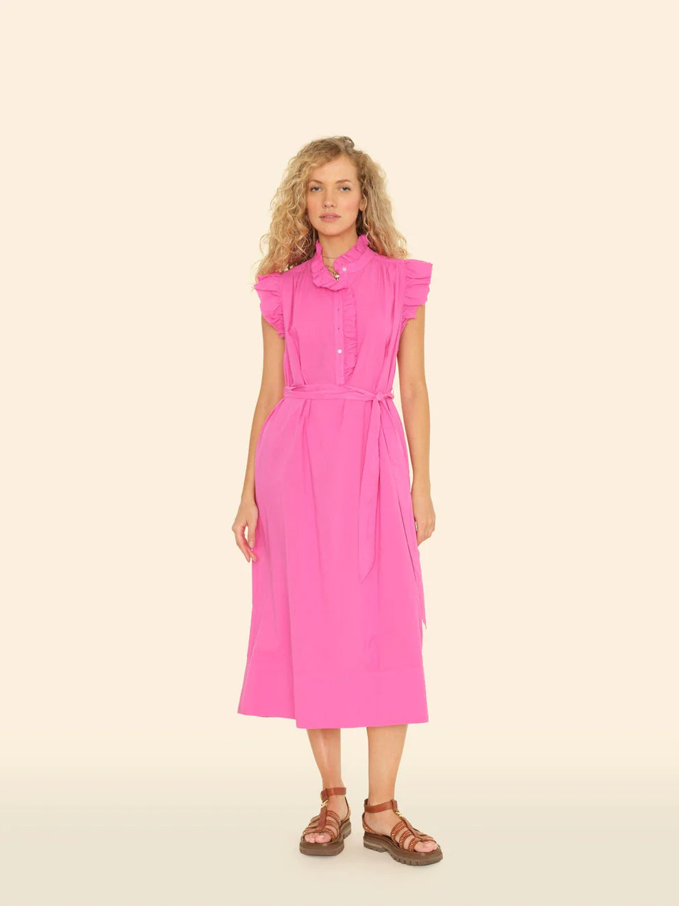 Blooming Marvelous. Meet April, a new season standout in vintage-inspired cotton silk voile with a delicate floral print. This fully lined midi dress is brimming with charm, featuring ruffle accents along the neckline, front placket, and sleeves. Designed with a partial button-front, side seam pockets, and a self-tie wrap waist, it’s the perfect blend of effortless elegance and playful romance.