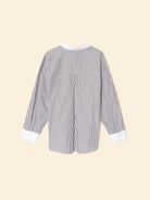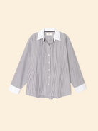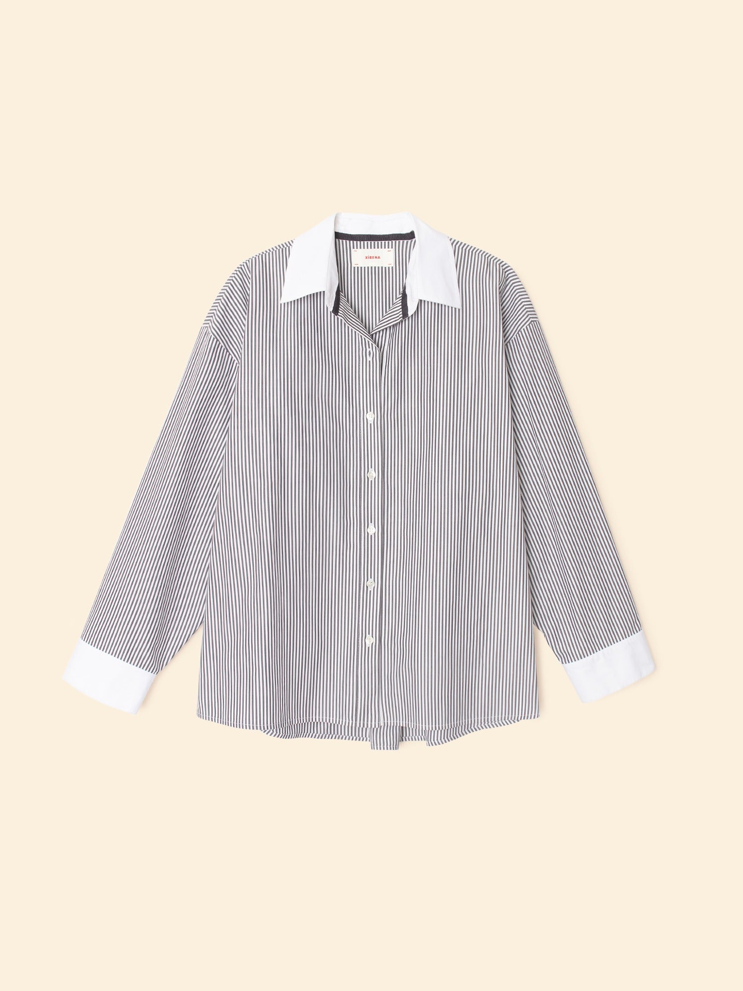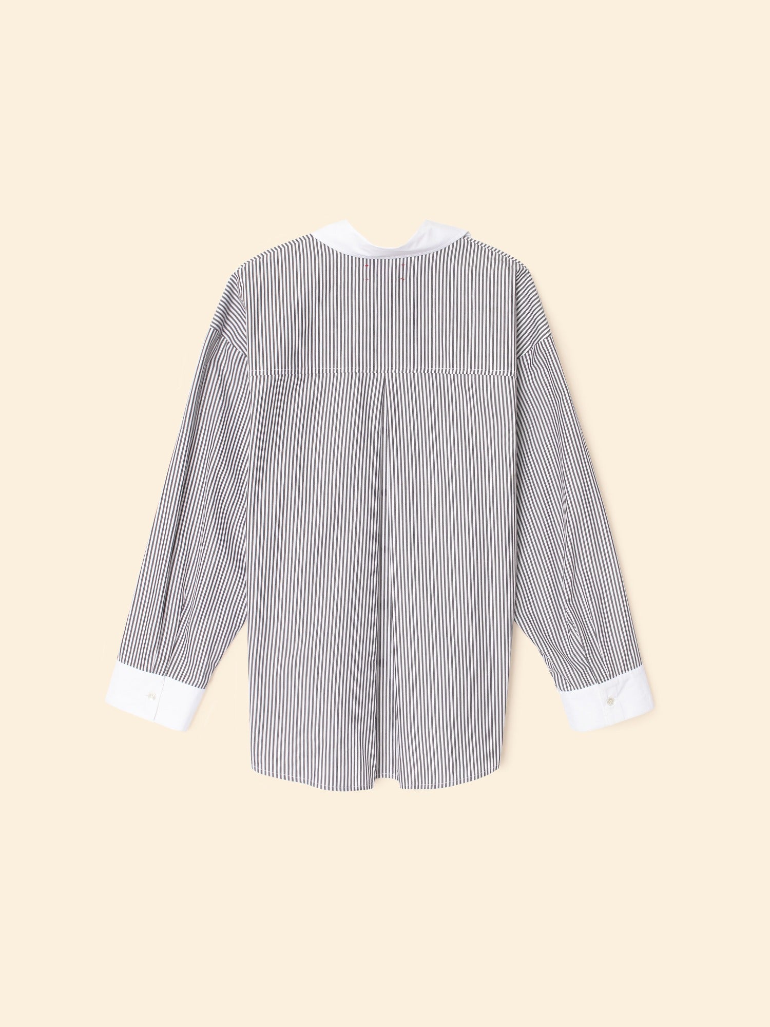 A modern take on the classic button-up, this striped shirt is designed with sharp contrast details. The slate-and-black stripes are accented by crisp white cuffs and a pointed collar, creating a polished, elevated look that transitions easily from work to weekend.