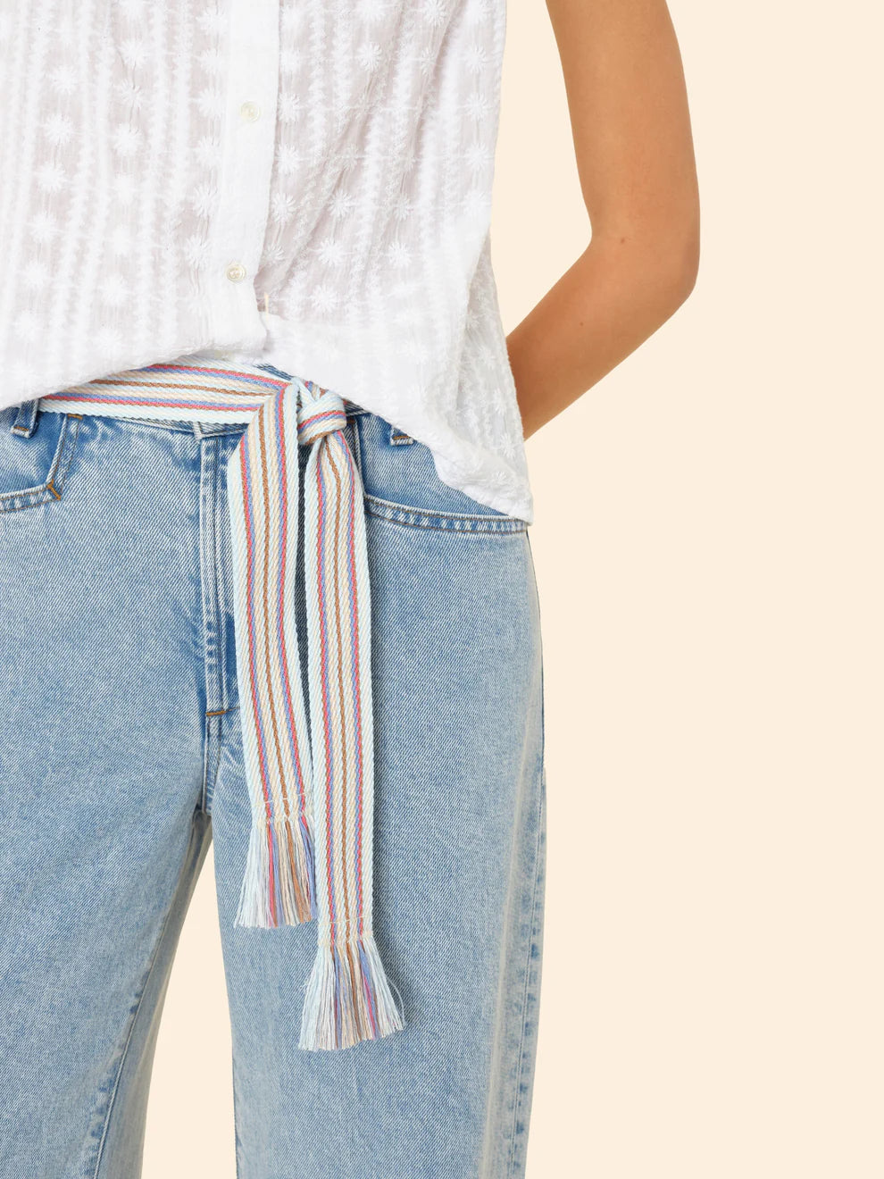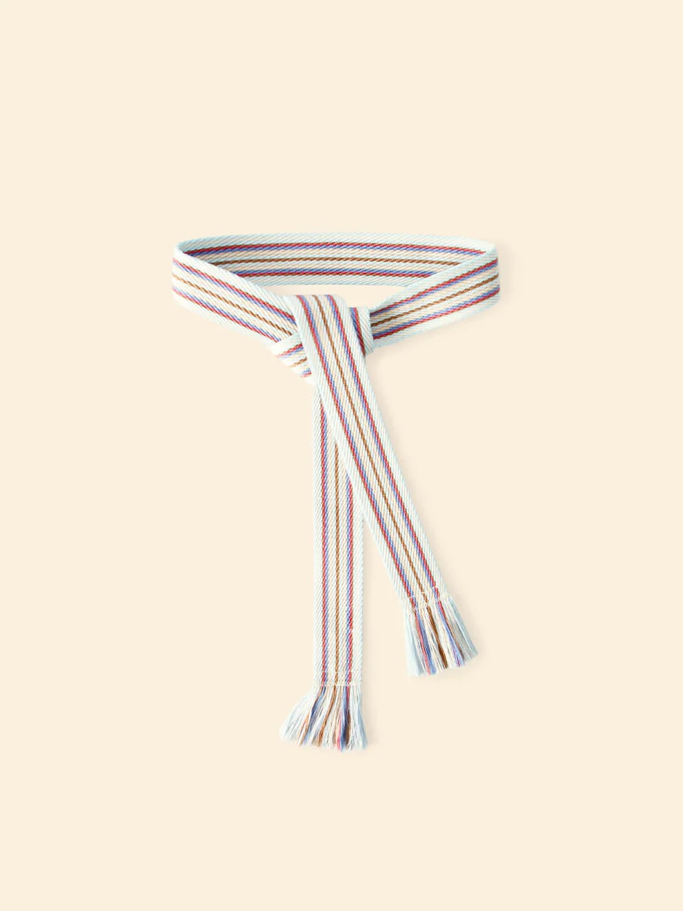 Tana is a vintage-inspired jacquard belt crafted from soft-woven fabric and detailed with vibrant multicolor stripes. Add it to the Renner Short or Boden Dress for a playful, colorful accent that ties your look together effortlessly.