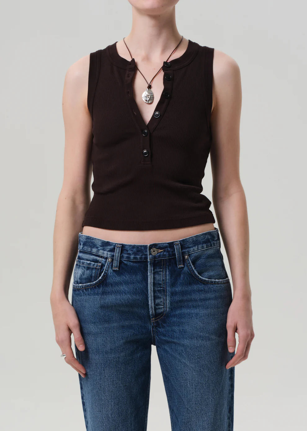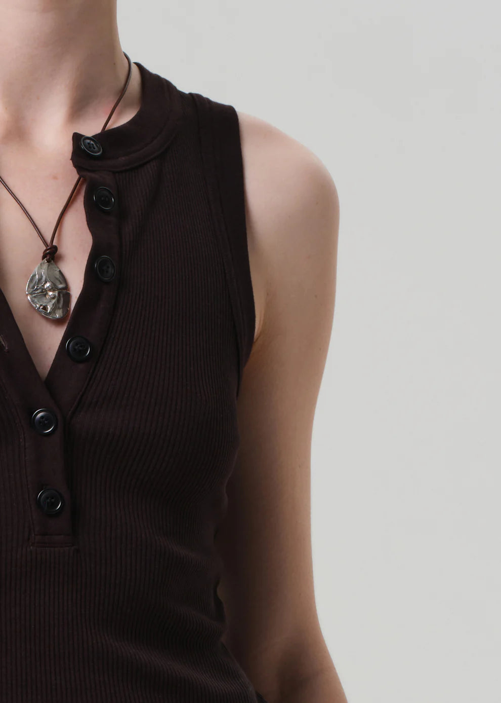 An elevated everyday staple, the Caralyn Tank is crafted from ultra-soft, supportive rib knit using regenerative cotton. Designed with a clean button front and slim, flattering fit, this sleeveless silhouette layers beautifully under shirts or stands effortlessly on its own with denim.