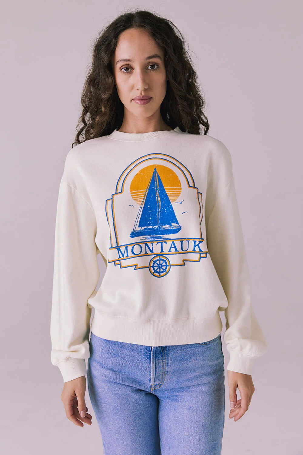 Soak up the vintage vacation vibes with the Montauk Sweatshirt. Inspired by dreamy 70s paperback covers, this cozy starry white layer features a nostalgic sailboat motif that captures the spirit of breezy beach days. Effortlessly chic and endlessly comfortable, it’s the perfect throw-on for cool mornings, coastal getaways, or just adding a touch of timeless sophistication to your everyday look. Escape to Montauk—no reservation required.