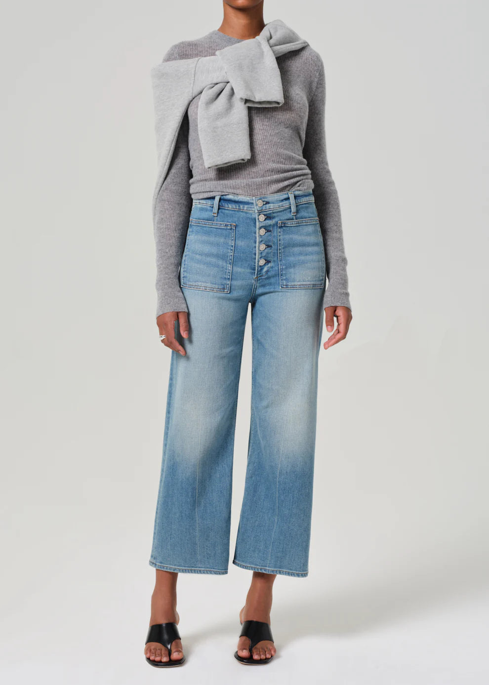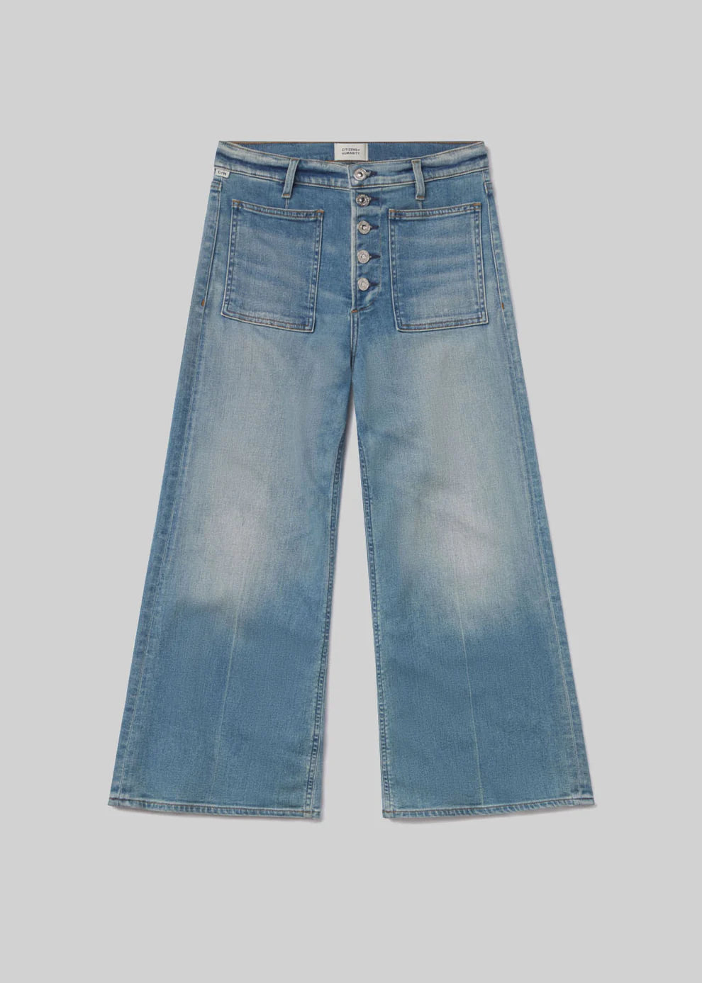 The Lyra is a vintage-inspired silhouette that sits high on the waist with an easy, relaxed top block and a cropped inseam, finished with a voluminous raw hem wide leg for a bold yet effortless look. Crafted in a medium indigo wash with front pockets and exposed buttons, it's made from our signature soft stretch denim that holds its shape all day. Fits true to size.