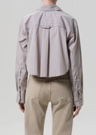 Tailored yet effortlessly cool, the Ana Shirt is crafted from ultra-lightweight, breathable cotton for an airy, comfortable feel. The cropped silhouette and pointed collar create a clean, modern shape, while grey and medium brown stripes lend a refined, menswear-inspired touch. Wear it on its own for a polished look or layer it over a fitted tank or tee for easy, laid-back styling.
