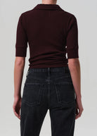 The Amina Polo is a refined wardrobe staple, crafted from ultra-soft, supportive rib for a smooth, sculpted fit. Featuring elbow-length sleeves and front patch pockets, it strikes a balance between clean structure and tactile detail. The deep Mahogany hue—layered with dark purple and brown undertones—adds a sophisticated, moody edge. Perfectly polished whether paired with tailored denim or sleek leather.