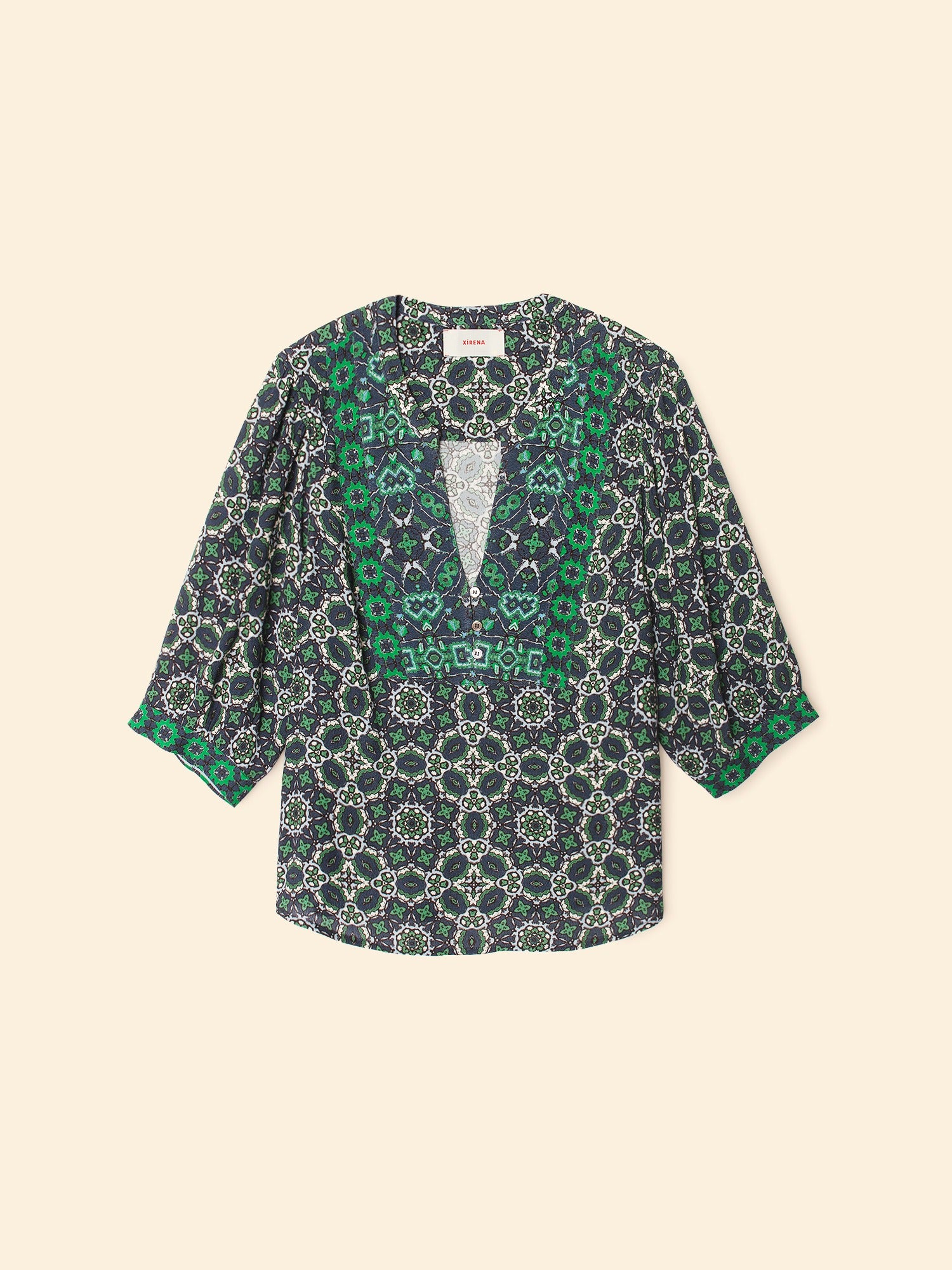 A bold blend of boho and vintage charm, this tile-print blouse is anything but ordinary. Crafted from a lightweight fabric, it features a rich navy base layered with intricate green and ivory geometric motifs. The standout deep V-yoke is framed by a contrast pattern that draws the eye, while subtle gathers at the shoulders add volume to the three-quarter sleeves. Finished with a relaxed, slightly boxy fit, this top is perfect for pairing with denim or wide-leg trousers for an effortlessly stylish look.