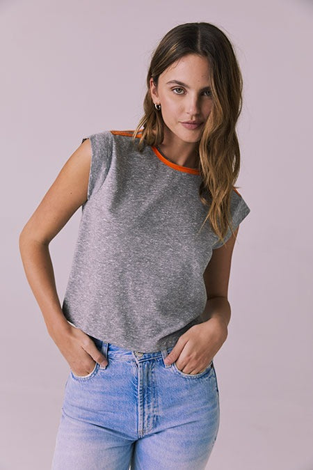 Meet your new off-duty favorite. This sleeveless heather gray tee features bold orange trim at the neckline and shoulders for a sporty pop of color. Designed with a relaxed, boxy fit and crafted from ultra-soft cotton, it’s the perfect blend of comfort and effortless cool. Pair it with denim for an easy weekend look or layer it under a blazer for a casual-cool twist.