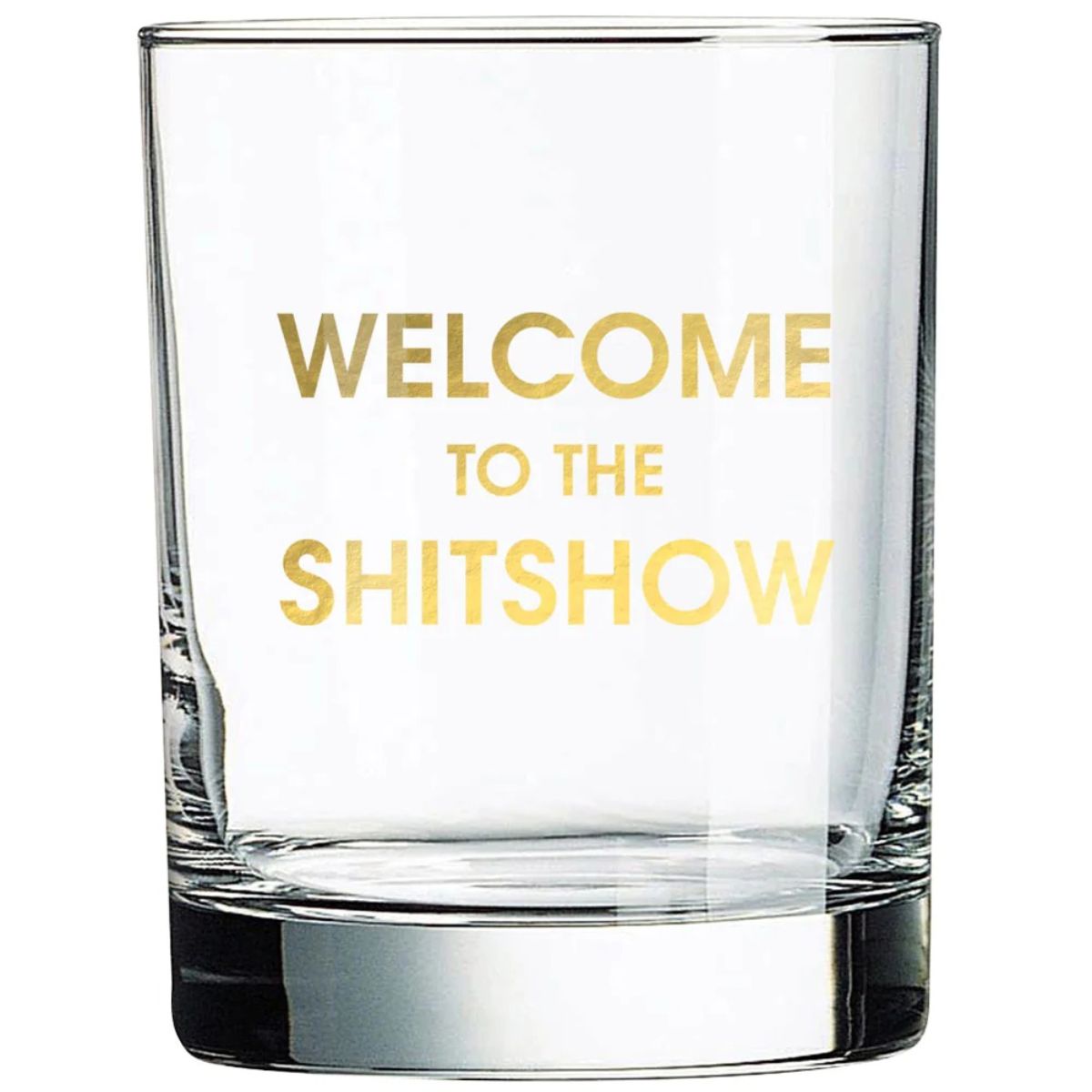 Crush your cocktail in style with our "Welcome to the Shitshow" gold foil rocks glass.