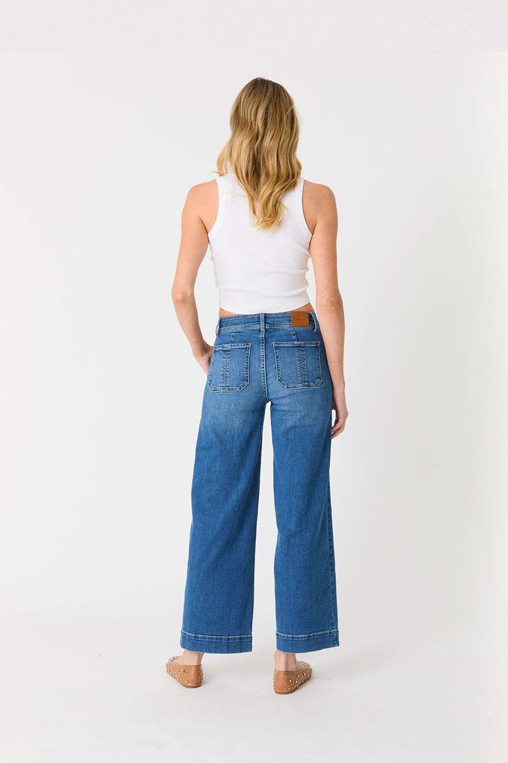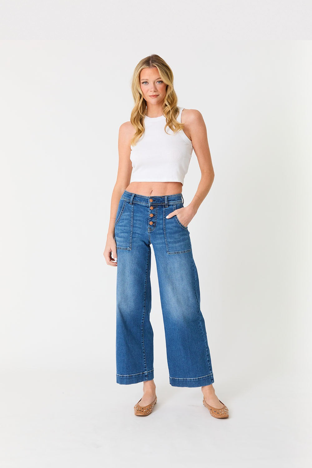 Discover effortless style with the Camille Exposed Button Wide Leg. Designed with a flattering mid-rise, this pant features an exposed button fly and pork chop pockets for a modern utilitarian edge. The ankle-length wide leg silhouette delivers timeless sophistication with a contemporary twist—perfect for pairing with everything from fitted knits to relaxed blouses.