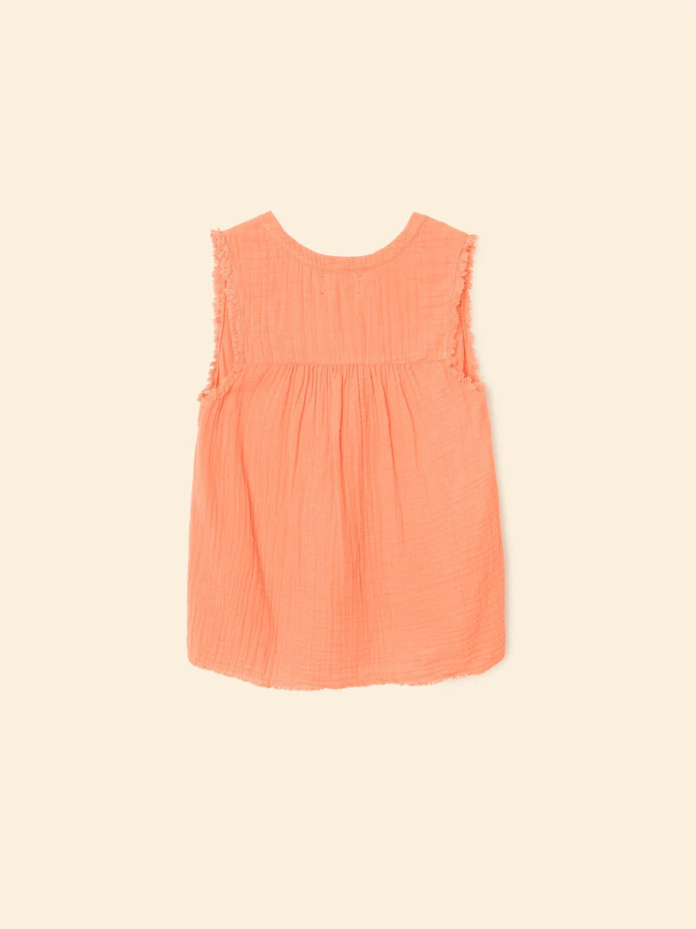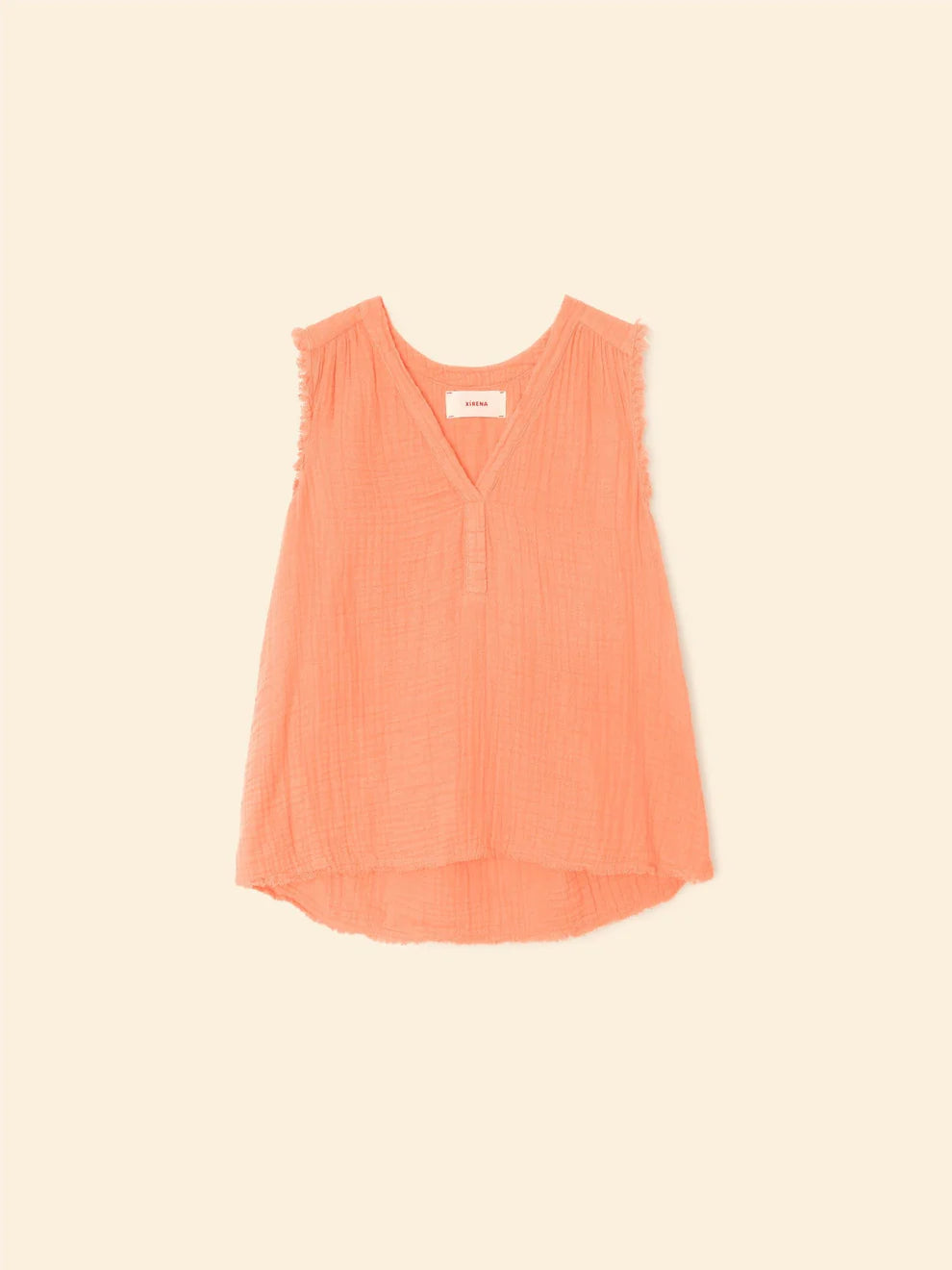 Easy Breezy. New this season, the Evva top is crafted from our washed double-faced cotton gauze for a soft, gently crinkled feel. This sleeveless pullover style features a V-neck with bar tack details, raw edge sleeves and hem, and delicate shirring at the front and back yokes for an effortlessly relaxed look.