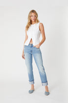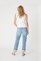 The Jessie Wide Cuff Slim Jean in Vintage Blue is a modern take on classic denim. Featuring a flattering slim fit through the hips and thighs, this style is finished with a bold wide cuff that adds just the right amount of edge. The vintage blue wash gives it a timeless, lived-in look, making it a versatile staple you'll reach for season after season. Dress it up with heels or keep it casual with sneakers—Jessie does it all.